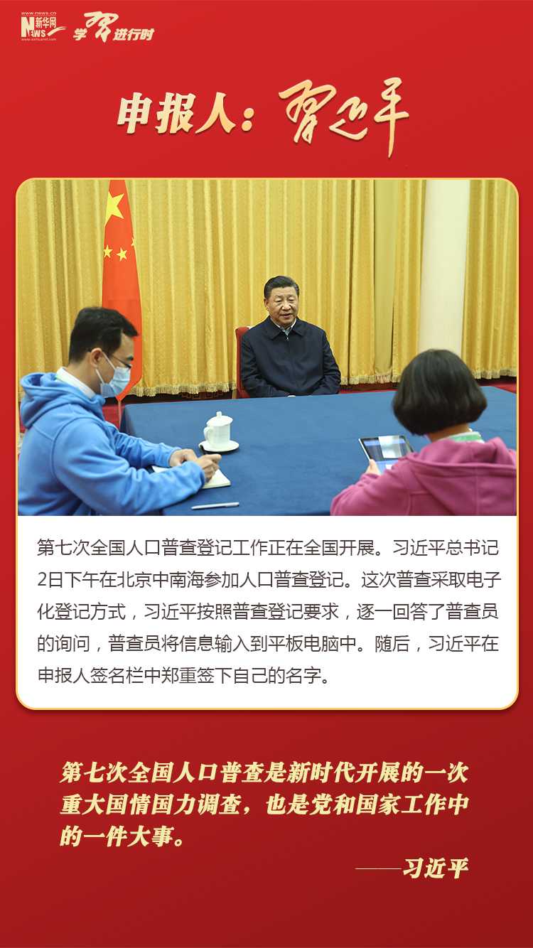 习近平在北京中南海参加全国人口普查登记,带头申报。他按照普查登记要求,逐一回答了普查员的询问,并在申报人签名栏中郑重签下自己的名字。